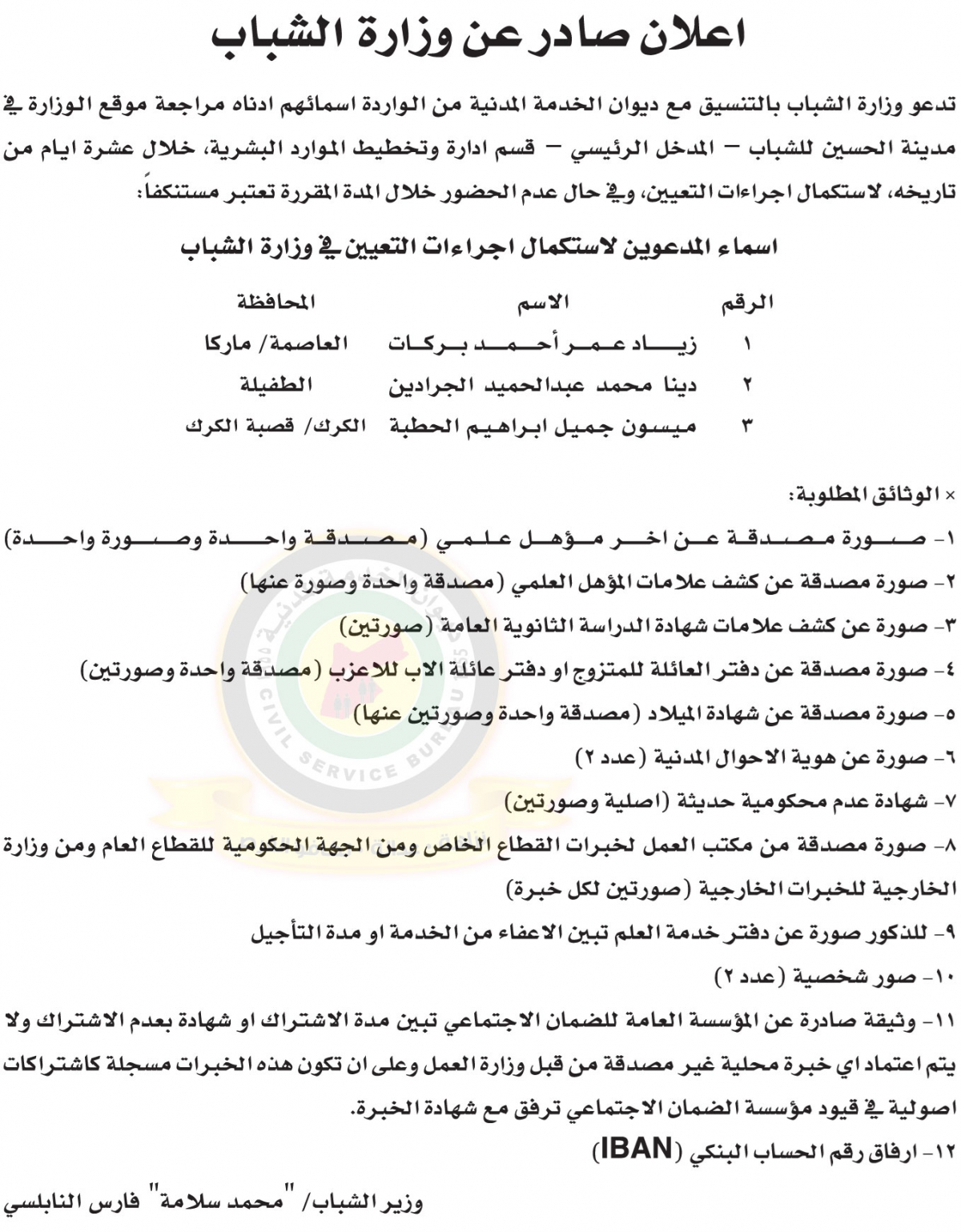 الوقائع الاخبارية: أعلنت وزارة الشباب وبالتنسيق مع ديوان الخدمة المدنية التالي أسماؤهم لاستكمال إجراءات التعيين.