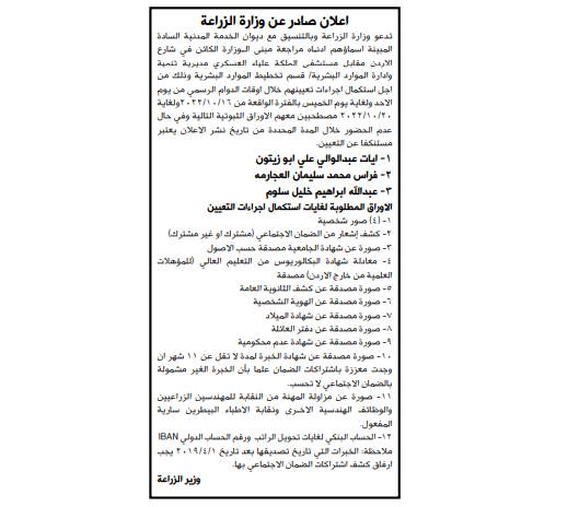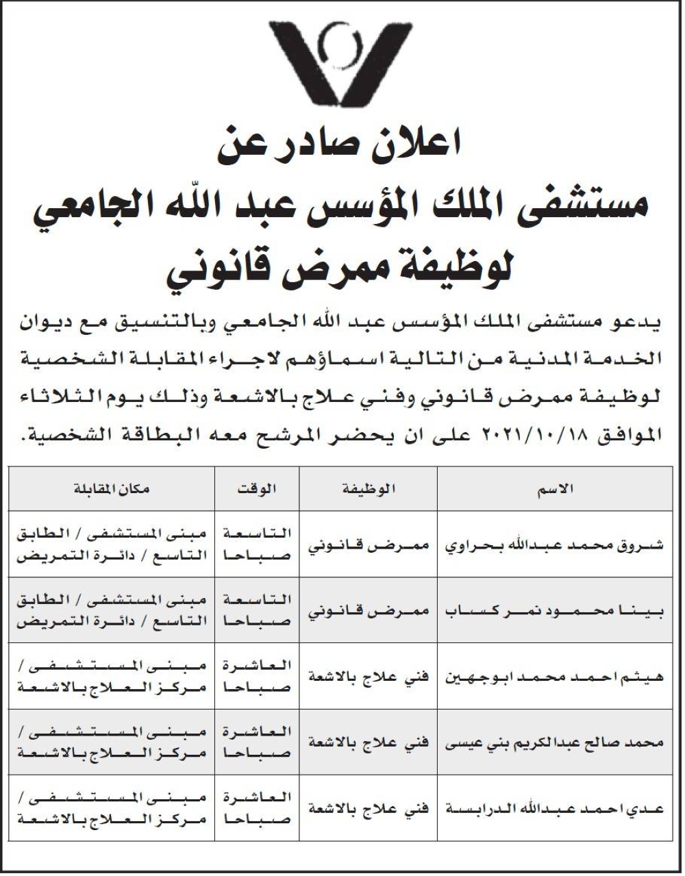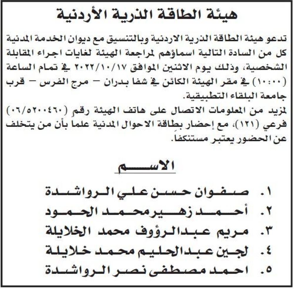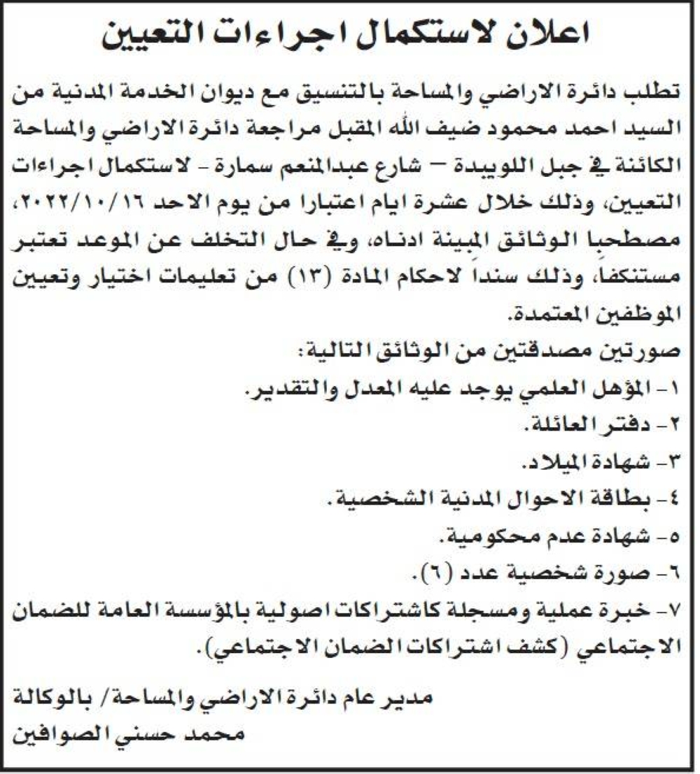 الوقائع الاخبارية:نشر ديوان الخدمة مجموعة من الإعلانات لإجراء مقابلات شخصية واستكمال إجراءات تعيين صادرة عن عدة مؤسسات وتاليا التفاصيل: