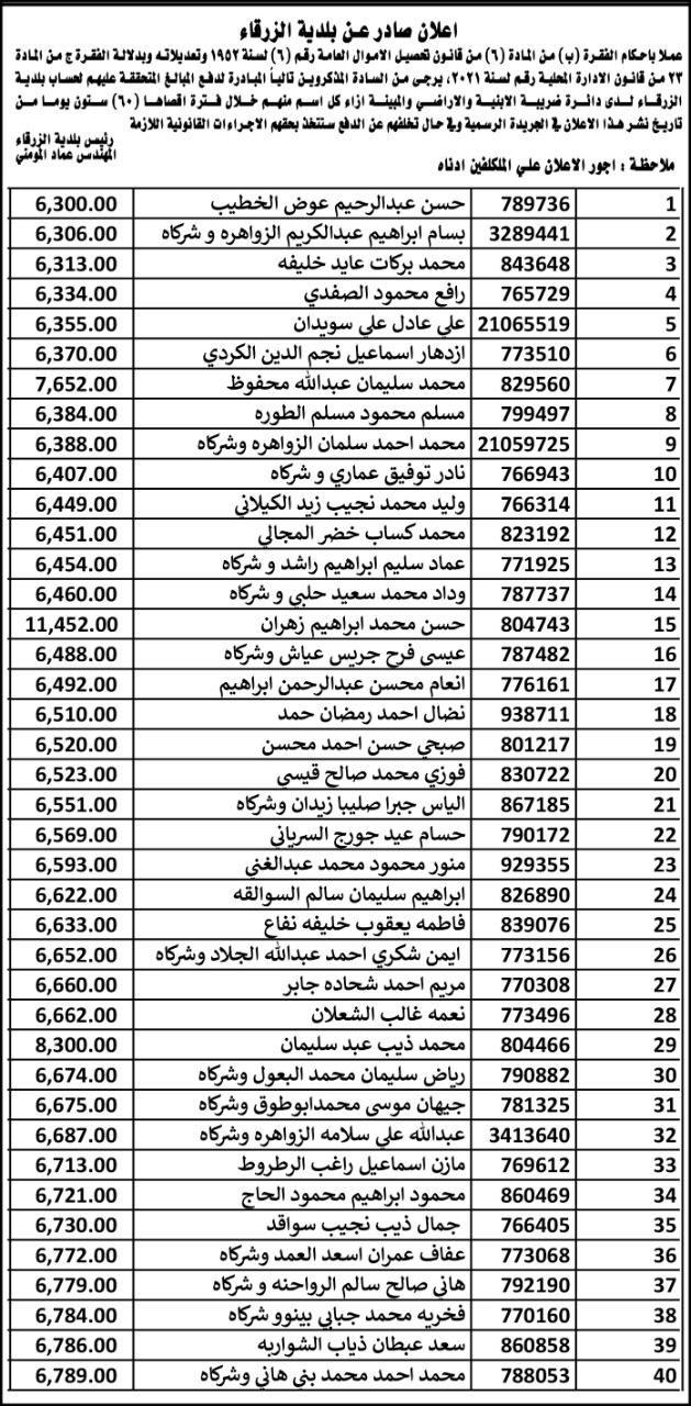بلدية الزرقاء تنشر اسماء الأشخاص المتخلفين عن دفع الضرائب