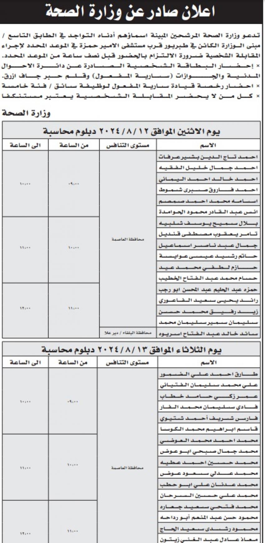 الوقائع الاخبارية: دعت وزارة الصحة، العشرات من المرشحين والمرشحات؛ لاستكمال إجراءات التعيين.