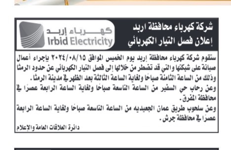 وقالت الشركة، إنها ستضطر لفصل الكهرباء من الساعة الثامنة صباحا وحتى الساعة الثالثة عصرا عن حدود الرمثا، في حين ستقوم بفصل التيار الكهربائي عن حي رحاب السفير في محافظة المفرق وعن سلحوب طريق عمان الجعيدية في محافظة جرش من الساعة التاسعة صباحا وحتى الرابعة عصرا.