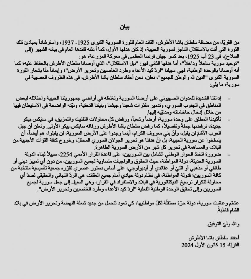 الوقائع الإخبارية: : أصدر أحفاد سلطان باشا الأطرش بيان إدانة للعدوان الإسرائيلي الواسع على الأراضي السورية واحتلالها لمناطق مختلفة وتدمير مقدرات الجيش السوري، واعتبروه خطراً داهماً.