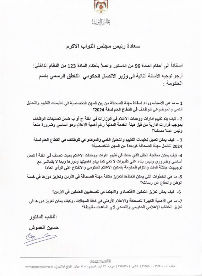 الوقائع الإخبارية : - قال وجه النائب حسين العموش سؤالا نيابيا إلى الحكومة، حول اسقاط مهنة الصحافة من بين المهن التخصصية في تعليمات التقييم والتحليل الكمي والموضوعي للوظائف في القطاع العام لسنة 2024.