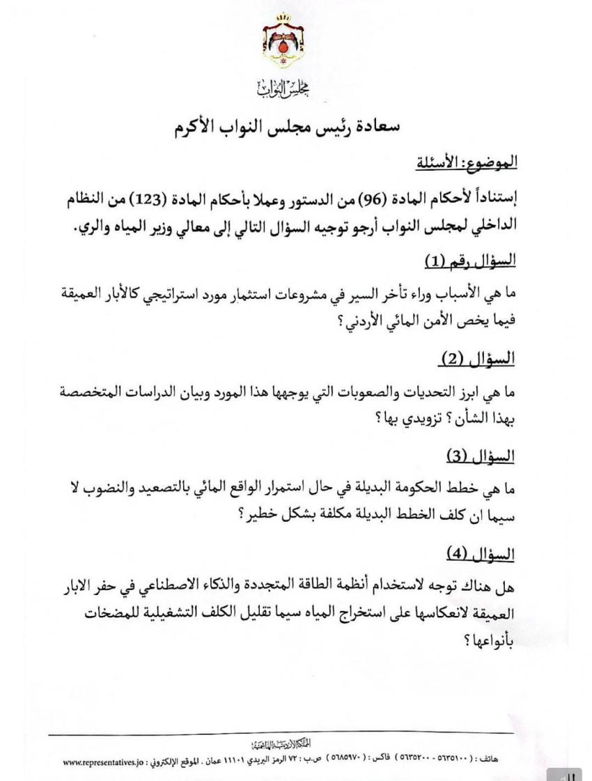 الوقائع الإخبارية : - وجه رئيس كتلة إرادة والوطن الاسلامي النيابية، الدكتور خميس عطية، سؤالا نيابيا لوزير المياه والري تضمنت عدة محاور مختلفة من استثمار الموارد الاستراتيجية للآبار العميقة والخطط البديلة في ظل الواقع المائي الحالي وقلة الأمطار.