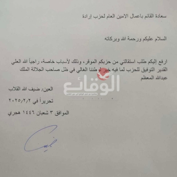 الوقائع الإخبارية : قدم العين والشيخ ضيف الله القلاب، اليوم الأحد، استقالته رسميًا من حزب إرادة، وذلك لأسباب خاصة، دون الكشف عن مزيد من التفاصيل.