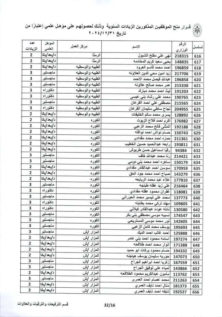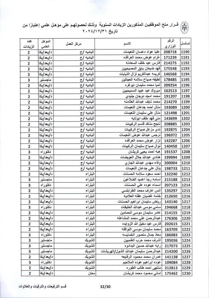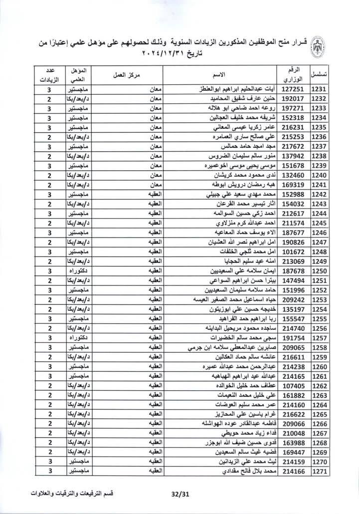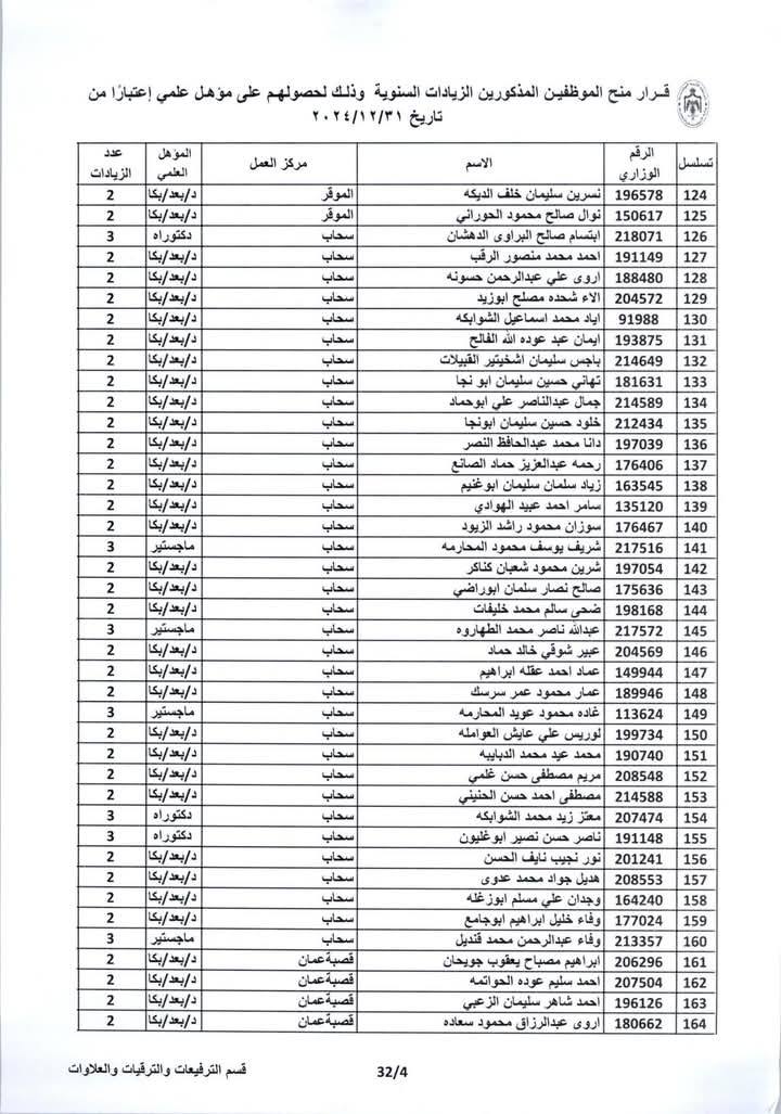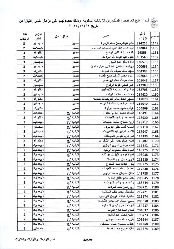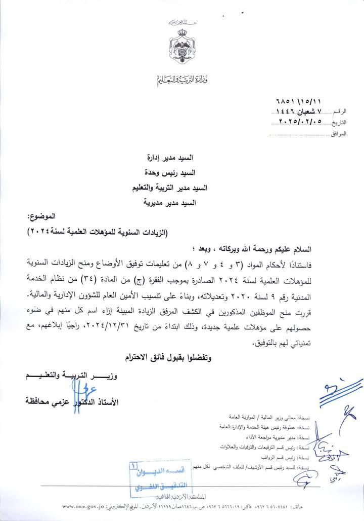 واستند محافظة إلى أحكام المواد (3,4,7,8) من تعليمات توفيق الاوضاع ومنح الزيادات السنوية للمؤهلات العلمية لسنة 2024 من نظام الخدمة المدنية رقم 9 لسنة 2020 وتعديلاته وبناء على تنسيب الأمين العام للشؤون الادارية والمالية.