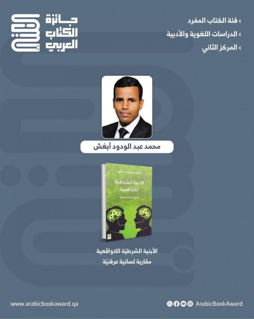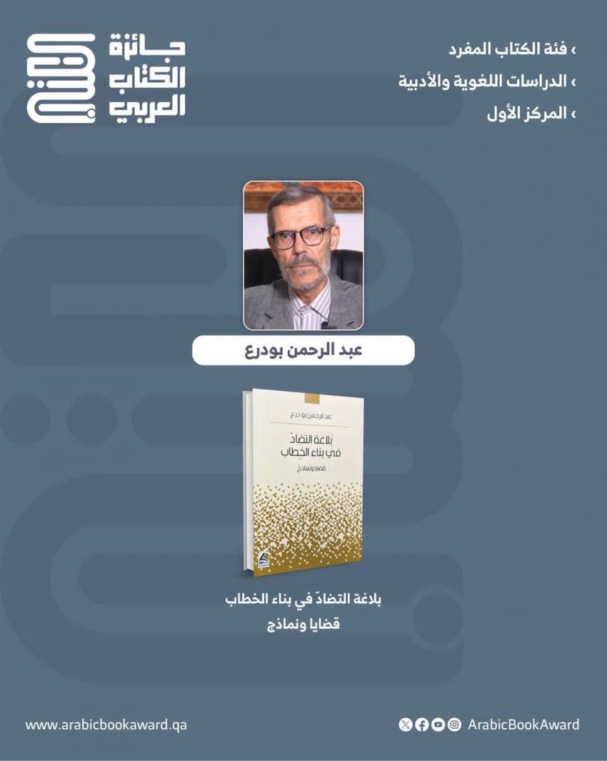 وفاز في فئة "الكتاب المُفرَد" بالمركز الأول في مجال "الدراسات اللغوية والأدبية"، عبد الرحمن بودرع، عن كتابه "بلاغة التضادّ في بناء الخطاب: قضايا ونماذج"، أمّا المركز الثاني فذهب إلى محمد عبد الودود أبغش، عن كتابه "الأبنية الشرطيّة اللاواقعية: مقاربة لسانية عرفنيّة".