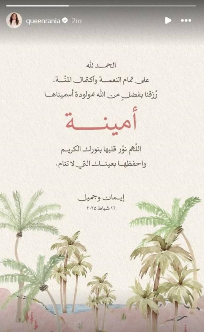 الوقائع الاخبارية: أعلنت جلالة الملكة رانيا العبدالله، عبر حسابها الرسمي على إنستغرام، عن قدوم حفيدتها الجديدة، حيث رزقت صاحبة السمو الملكي الأميرة إيمان بنت عبدالله الثاني، وزوجها السيد جميل ألكساندر ترميوتس، بمولودتهما الأولى، التي أسمياها أمينة.
