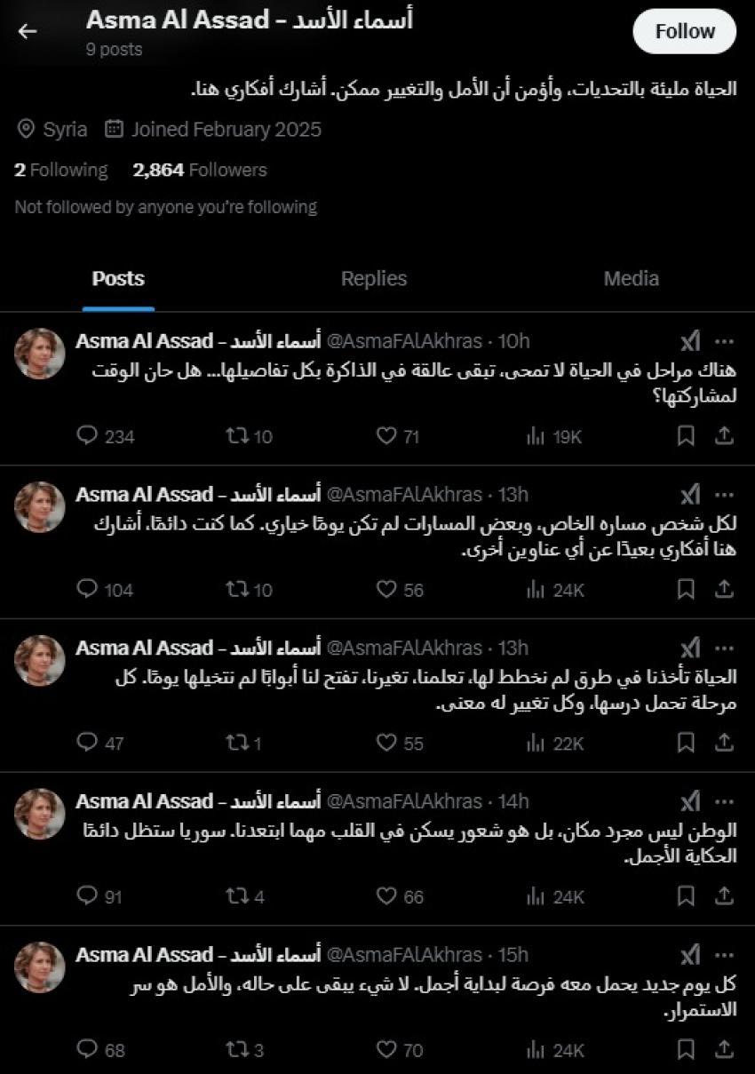 وكتب الأسد الابن: "أعلن لكم عن حساب السيدة أسماء الأسد على منصة إكس. الحساب سيكون بعيدا عن السياسة، ويهدف إلى تقديم محتوى يعكس جوانب مختلفة من حياتها وأنشطتها الإنسانية".