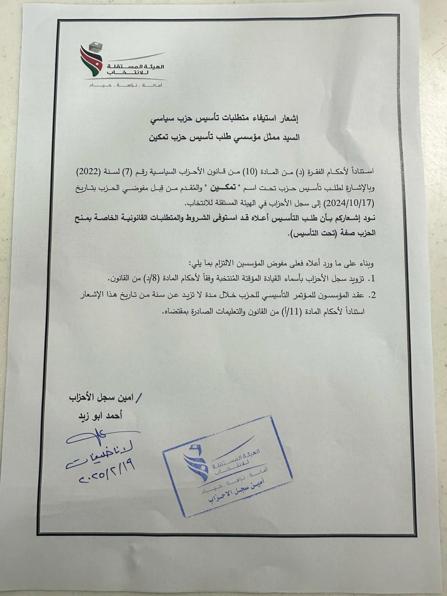 وأكدت الهيئة في الإشعار الذي وجهته للحزب ضرورة تزويد سجل الأحزاب بأسماء القيادة المؤقتة المنتخبة وفقا لأحكام المادة "8/د” من القانون، وأن يعقد المؤسسون المؤتمر التأسيسي للحزب خلال مدة لا تزيد عن سنة من تاريخ هذا الإشعار استنادا لأحكام المادة "11/أ” من القانون والتعليمات الصادرة بمقتضاه.