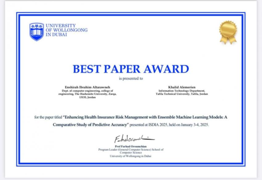 الوقائع الإخبارية: حصلت الدكتورة انشراح الطراونه الأستاذ المساعد في قسم هندسة الحاسوب بكلية الهندسة في الجامعة الهاشمية، على جائزة أفضل ورقة بحثية خلال مشاركتها في المؤتمر الدولي التاسع لتصميم أنظمة المعلومات والتطبيقات الذكيةISDIA-2025، الذي نظمته جامعة ولونغونغ (UOWD) في الإمارات العربية المتحدة الذي عقد مطلع العام الحالي.