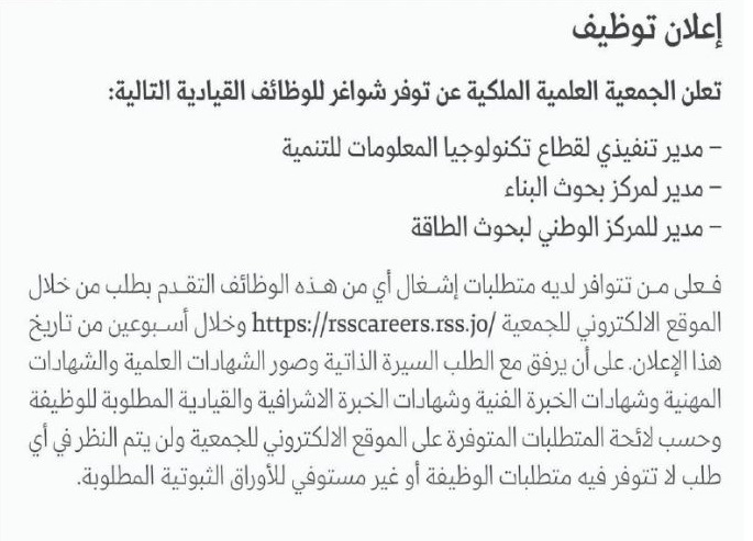 الوقائع الاخبارية: أعلنت الجمعية العلمية الملكية، الثلاثاء، عن توفر عدد من الشواغر لوظائف قيادية.