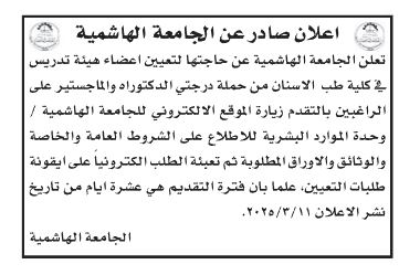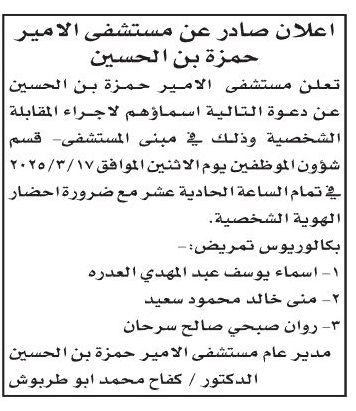 كما أعلنت مؤسسات رسمية، عن حاجتهم لتعبئة وظائف شاغرة، فيما دعت أخرى مرشحين لإجراء المقابلة الشخصية.