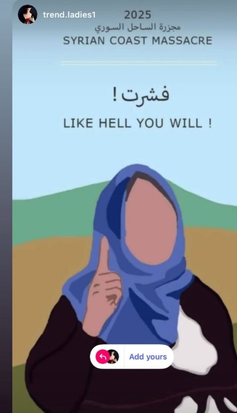 الوقائع الإخبارية: - تضامن عدد من النجوم السوريين مع الأم السورية التي فقدت أولادها في أحداث الساحل السوري. فنشرت النجمة سلاف فواخرجي صورة للأم المكلومة مع تعليق "فشرت".