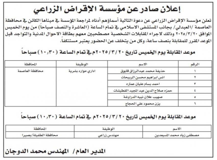 بالأسماء .. مؤسسات حكومية تعلن عن شواغر وتدعو مرشحين لمقابلات شخصية