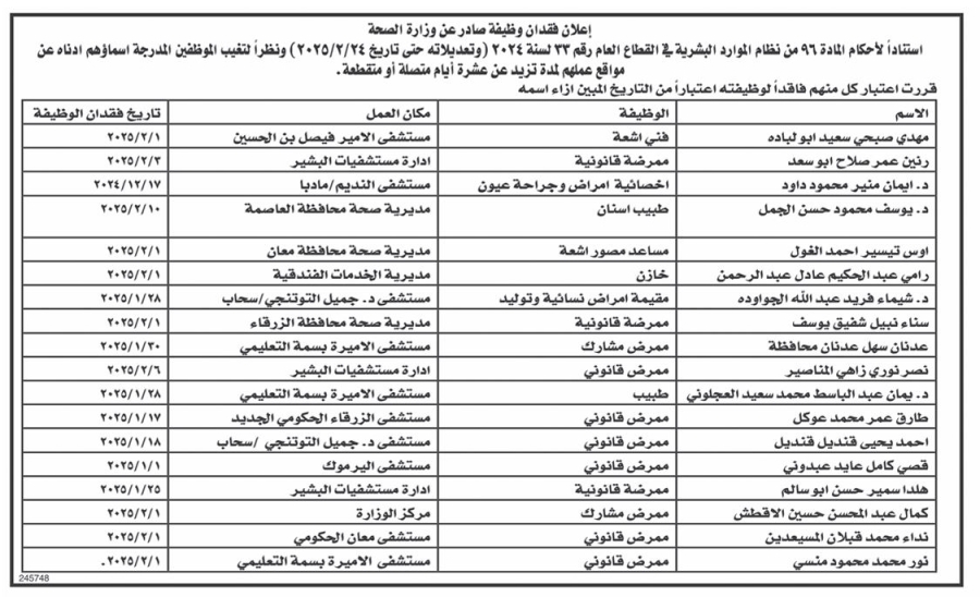 الوقائع الاخبارية:أعلنت وزارة الصحة، اليوم الاثنين، عن فقدان موظفين لوظائفهم، وذلك نظرا لتغيبهم عن مواقع عملهم لمدة تزيد عن 10 أيام متصلة أو متقطعة.