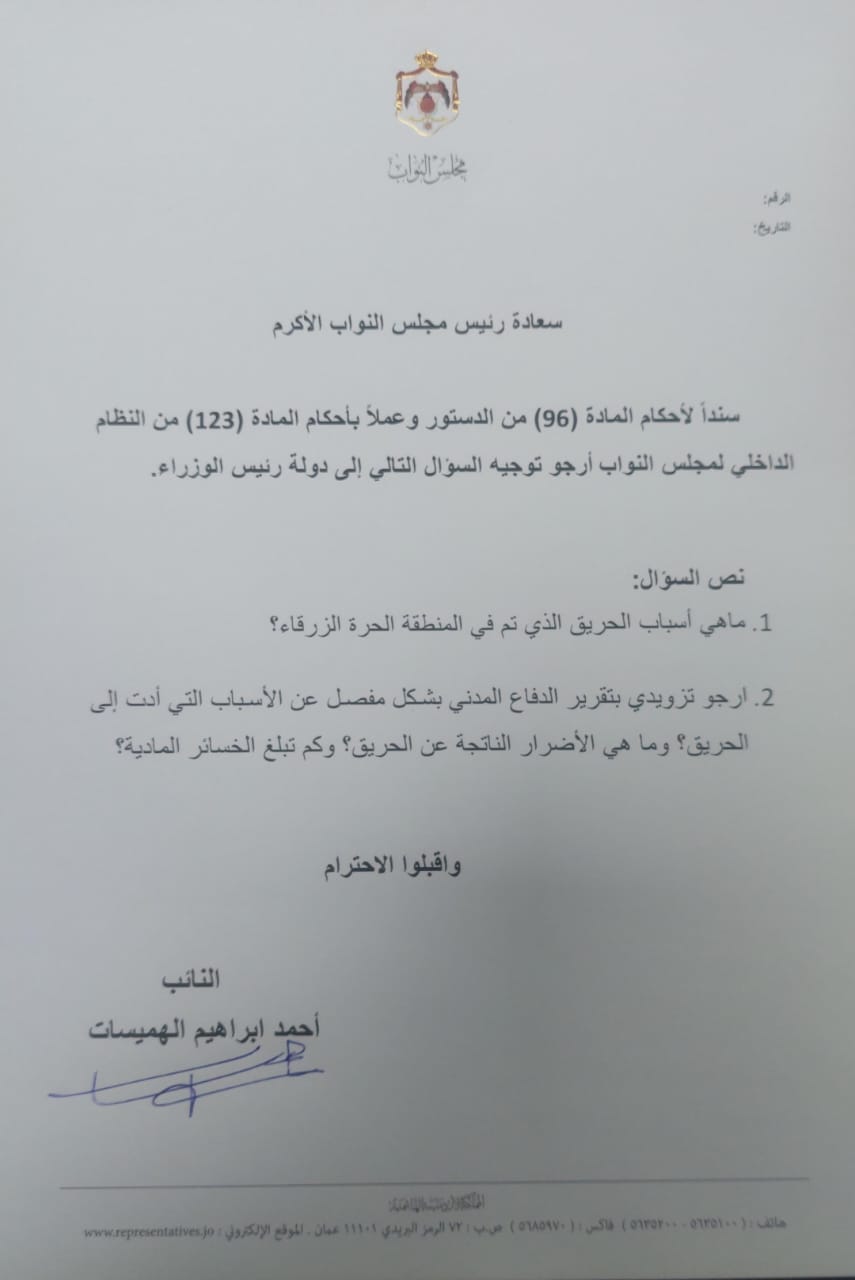 الوقائع الإخبارية: وجه النائب الثاني لرئيس مجلس النواب احمد الهميسات سؤالاً نيابياً لدولة رئيس الوزراء جعفر حسان حول أسباب حريق المنطقة الحرة في الزرقاء مطالباً بتزويده بتقرير الدفاع المدني بشكل مفصل عن الأسباب التي أدت إلى الحريق وما هي الأضرار الناتجة وقيمة الخسائر المادية.