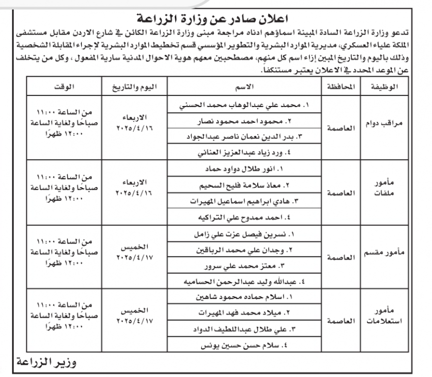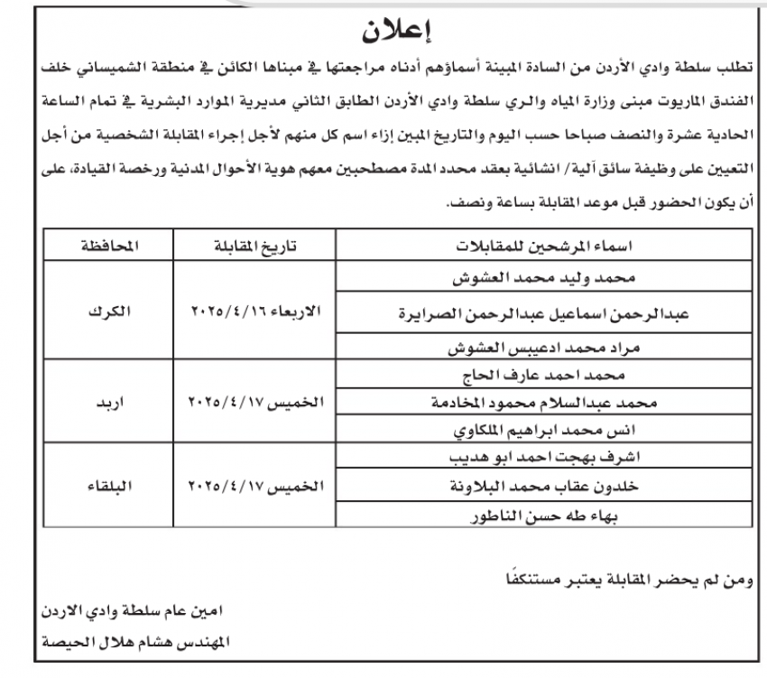 الوقائع الإخبارية: دعت وزارة الزراعة وسلطة وادي الأردن مرشحين لإجراء المقابلات الشخصية لغايات التعيين.