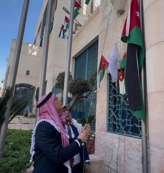 وقام المحافظ برفع العلم على السارية امام مبنى البنك المركزي الاردني.