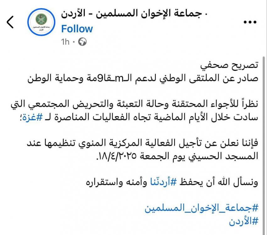 وجاء في بيان للجماعة: نظراً للأجواء المحتقنة وحالة التعبئةوالتحريض المجتمعي التي سادت خلال الأيام الماضية تجاه الفعاليات المناصرة لـغزة، فإننا نعلن عن تأجيل الفعالية المركزية المنوي تنظيمها عند الحسيني الجمعة 18/4 ، ونسأل الله أن يحفظ أردننا وأمنه واستقراره".