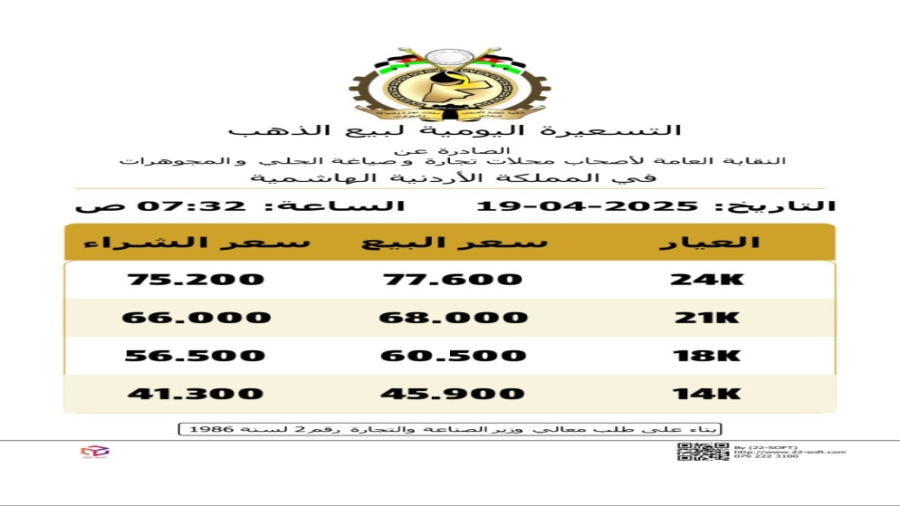 ووفقا للائحة الأسعار التي نشرتها النقابة العامة لأصحاب محالّ تجارة وصياغة الحلي والمجوهرات، فقد بلغت أسعار بيع الغرامات من الذهب عياري 24 و18 و14 في المحال 77.6 دينارا و60.5 دينارا و45.90 دينارا على التوالي.