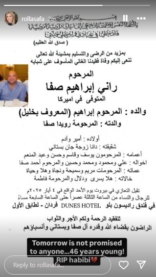وعبّرت صفا عن حزنها لخسارة قريبها، وكتبت: "46 سنة، فلترقد روحك بسلام حبيبي".