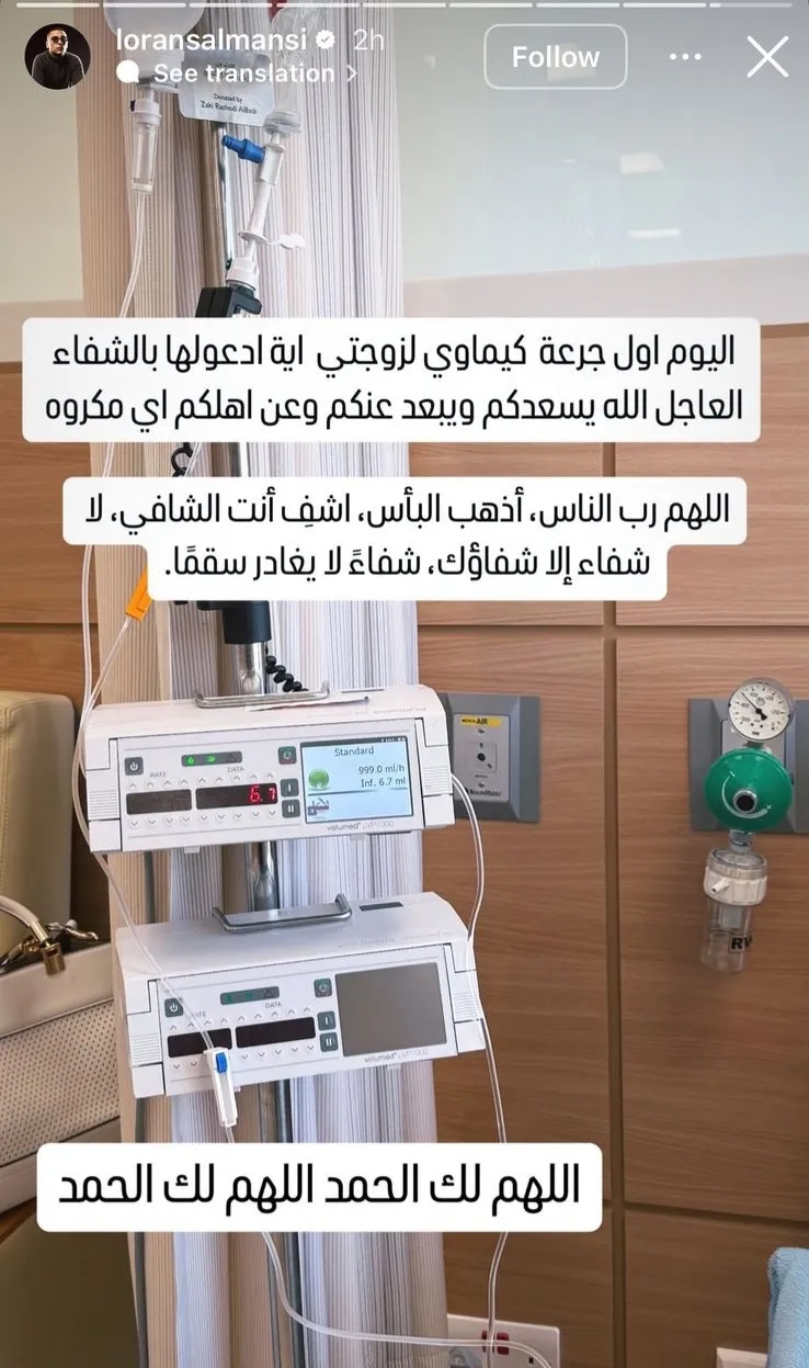 ونشر المنسي صورةً لمجموعة من الأجهزة الطبية، وكتب عليها أن زوجته آية خضعت اليوم لأول جرعة من العلاج الكيميائي، طالبًا من متابعيه الدعاء لها بالشفاء.