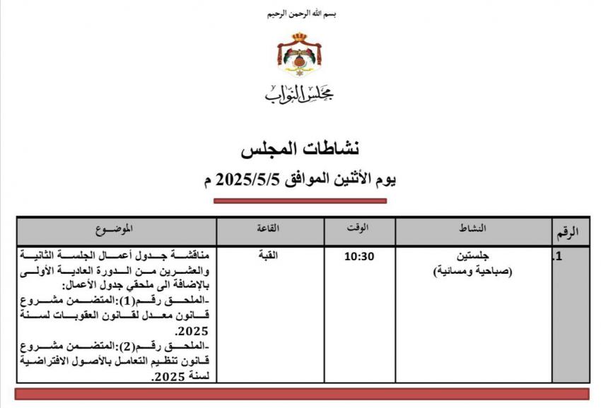 الوقائع الإخبارية : يعقد مجلس النواب الإثنين 5 أيار 2025، جلستين صباحية ومسائية، حيث يتضمن جدول أعماله عددًا من القضايا المهمة.