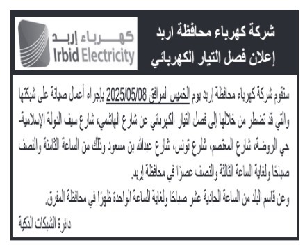 الوقائع الاخبارية: أعلنت شركة كهرباء محافظة إربد أنها ستنفذ أعمال صيانة على شبكتها الكهربائية يوم الخميس الموافق 8 أيار 2025، مما يستدعي فصل التيار الكهربائي عن عدد من المناطق في محافظتي إربد والمفرق.