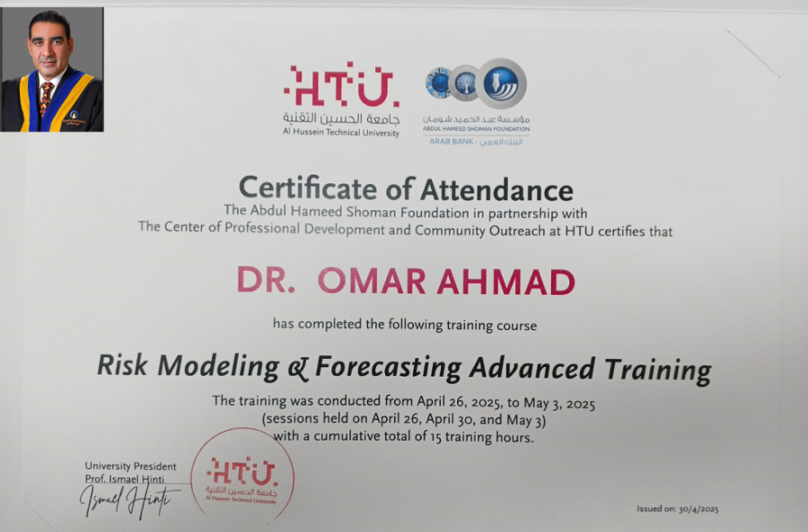 الوقائع الاخبارية:ضمن إطار سعي جامعة عمان العربية المستمر لتعزيز مهارات أعضاء هيئة التدريس في مجال البحث العلمي والتقنيات الحديثة وبتوجيهات من الأستاذ الدكتور محمد الوديان رئيس الجامعة، شارك الدكتور عمر أسعد عضو هيئة التدريس في كلية الهندسة في دورة تدريبية متقدمة بعنوان "نمذجة المخاطر والتنبؤ بها" (Risk Modeling and Forecasting Advanced Training)، بتنظيم من جامعة الحسين التقنية وبالتعاون مع مؤسسة عبد الحميد شومان.