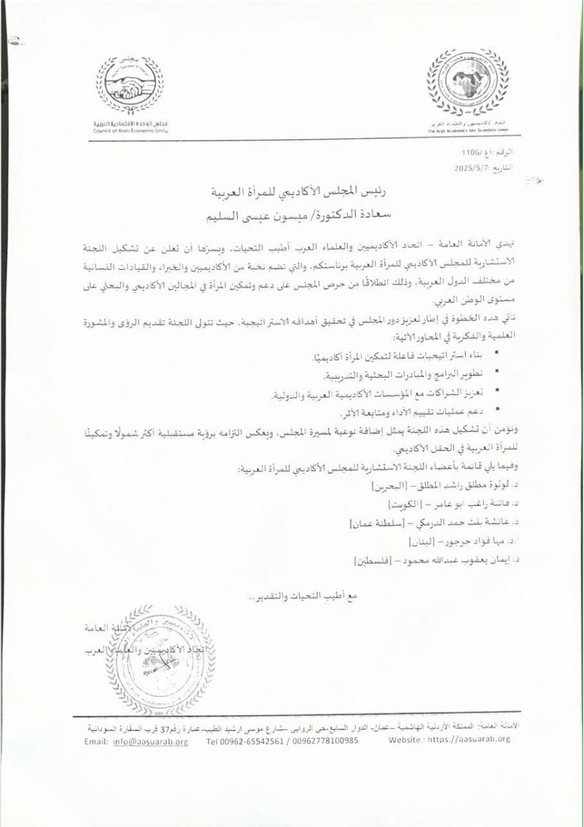 الوقائع الإخبارية : بناءً على القرار الصادر عن الأمانة العامة لاتحاد الأكاديميين والعلماء العرب، تم الإعلان عن تشكيل اللجنة الاستشارية العليا للمجلس الأكاديمي للمرأة العربية، وذلك في خطوة محورية تهدف إلى ترسيخ البنية المرجعية للمجلس وبلورة توجهاته الفكرية على المستوى العربي.