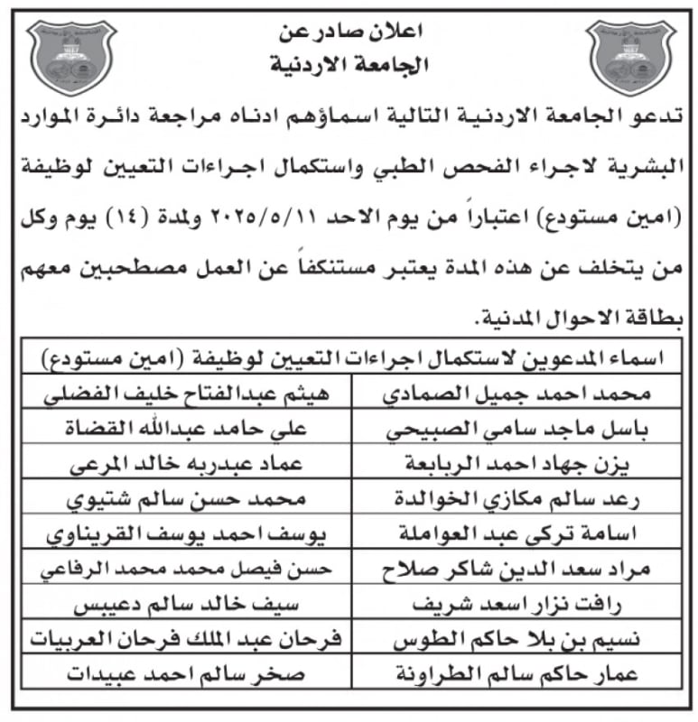 الوقائع الاخبارية: أعلنت عدد من المؤسسات الرسمية، اليوم الخميس، عن حاجتها لتعبئة وظائف شاغرة، فيما دعت أخرى عددًا من المرشحين لإجراء المقابلات الشخصية.