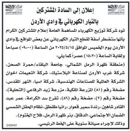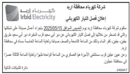 الوقائع الاخبارية:- أعلنت شركة كهرباء محافظة إربد وشركة توزيع الكهرباء عن فصل مبرمج للتيار الكهربائي في عدد من مناطق محافظتي إربد وعجلون ووادي الأردن، يوم الخميس الموافق 15 أيار 2025، وذلك في إطار أعمال الصيانة الدورية التي تهدف إلى تعزيز كفاءة الشبكة وتحسين جودة الخدمة الكهربائية المقدّمة للمواطنين.
