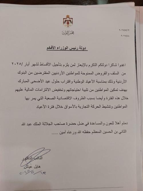وأشار النائب في كتابه إلى أن هذا الطلب يأتي تزامنًا مع الأعياد الوطنية واقتراب عيد الأضحى المبارك، وذلك بهدف تمكين المواطنين من تلبية احتياجاتهم وتخفيف الأعباء المالية المترتبة عليهم خلال هذه الفترة، خاصة في ظل الظروف الاقتصادية الصعبة التي يمر بها العديد من الأسر الأردنية.