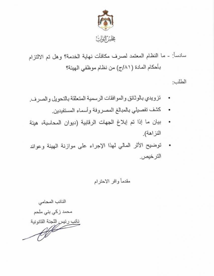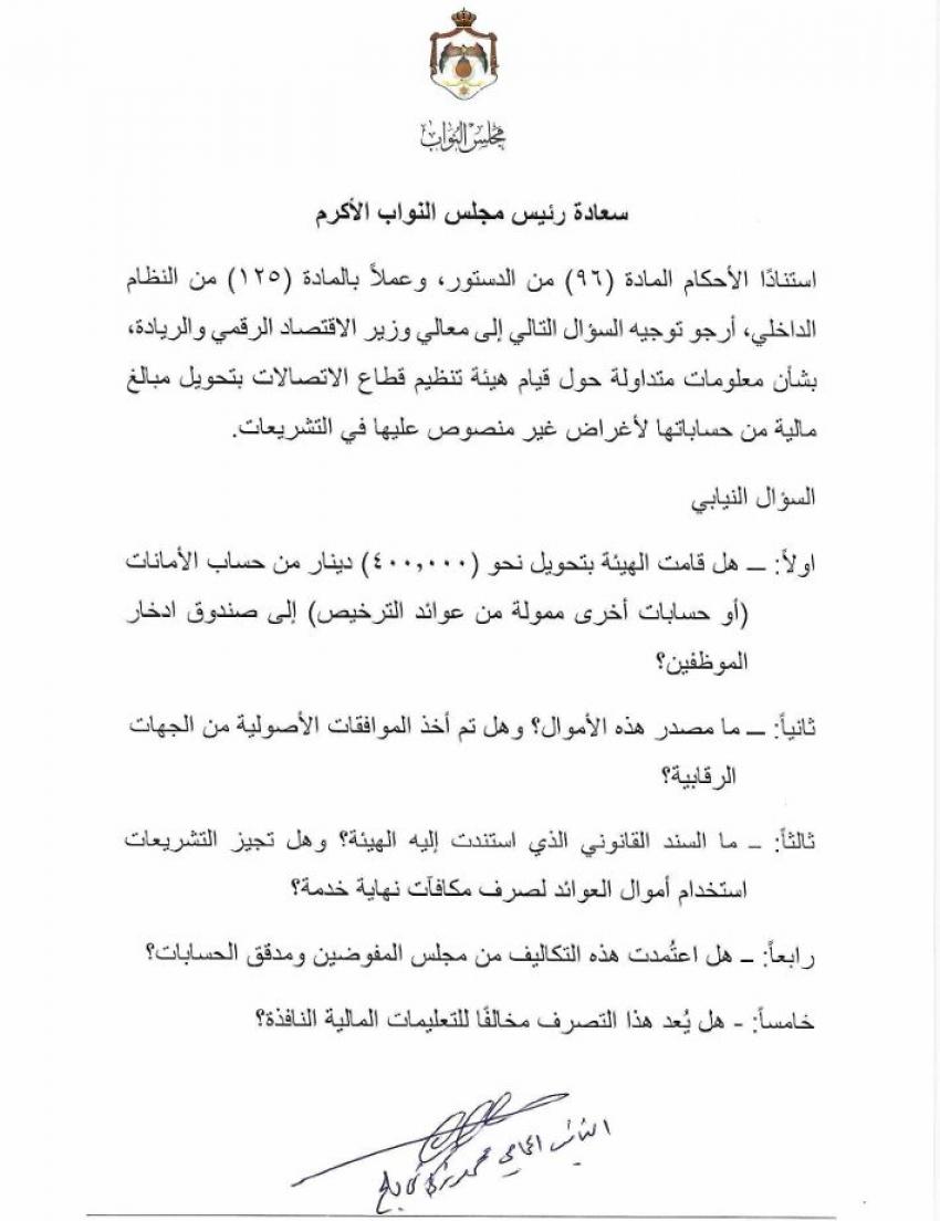 الوقائع الإخبارية : وجه النائب محمد بني ملحم، سؤالا نيابيا إلى وزير الاقتصاد الرقمي والريادة، حول تحويل هيئة تنظيم الاتصالات مبلغ 400 ألف دينار من حساب الامانات إلى صندوق ادخار الموظفين.