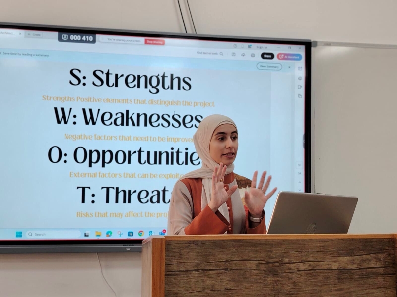 وقدمت المهندسة دويك عرضاً شاملاً لأهم المبادئ التي تشكل قاعدة التصميم المعماري، مستعرضةً خطوات التحليل المعماري، وآليات تطوير الفكر التصميمية، وأهمية فهم العلاقة بين الشكل والوظيفة في خلق بيئة معمارية ناجحة، كما شاركت تجربتها العملية بعد التخرج، مسلطةً الضوء على التحديات التي يواجهها المعماريون في سوق العمل، وموضحةً سبل التعامل معها.