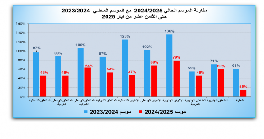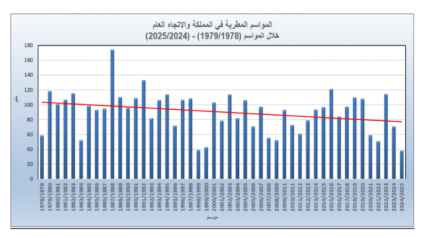 واضاف أنّ الإحصاءات المناخية في إدارة الأرصاد الجوية تشير بأن الموسم المطري الحالي 2024/2025 يعتبر أضعف موسم مطري منذ موسم 1978/1979، حيث تشير رسوم بيانية من إعداد الإدارة إلى تناقص متوسط كميات الأمطار الموسمية للمملكة بحوالي 0.6 ملم لكل موسم مطري.