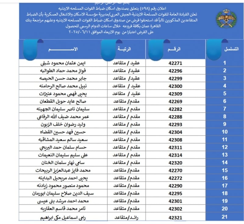 ودعت القيادة الضباط وضباط الصف والأفراد مراجعة بنك القاهرة عمان بكافة فروعه خلال ساعات الدوام الرسمي اعتباراً من يوم الاربعاء الموافق 11/06/2025 للحصول على القرض.