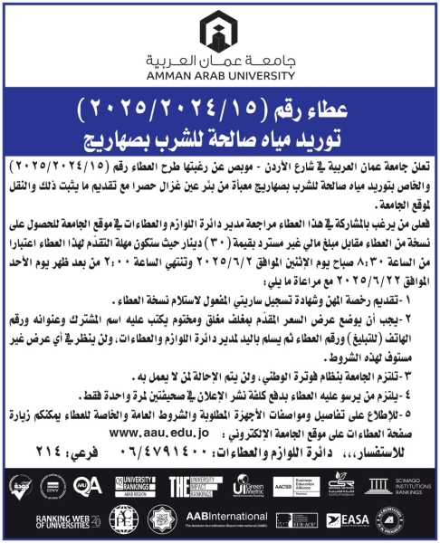 الوقائع الاخبارية:تعلن جامعة عمان العربية عن رغبتها بطرح عطاء رقم (15/2024-2025) توريد مياه صالحة للشرب بصهاريج