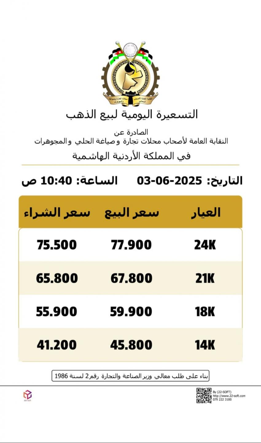 وبحسب التسعيرة اليومية، بلغ سعر بيع غرام الذهب من عيار 21 لغايات البيع لدى محالّ الصاغة 67.8 دينارًا، مقابل 65.8 دينارًا لجهة الشراء.