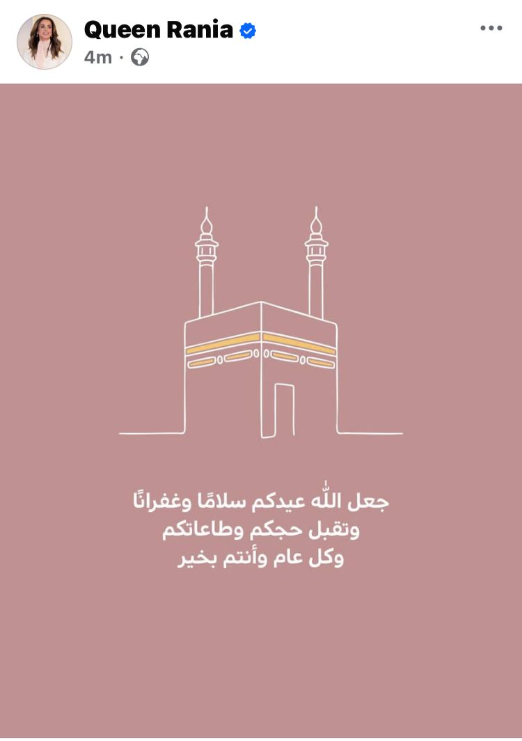 ونشرت جلالتها عبر موقع التواصل الاجتماعي انستقرام صورية عبر خاصية الستوري، صورة كتب عليها "جعل الله عيدكم سلامًا وغفرانًا وتقبل حجكم وطاعاتكم . كل عام وأنتم بخير".