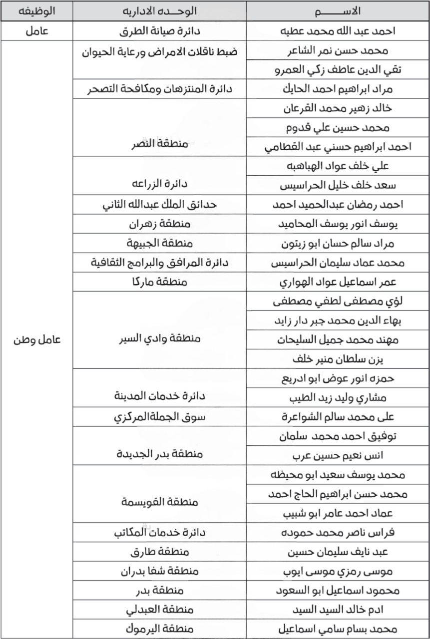 الوقائع الاخبارية: أنذرت أمانة عمان الكبرى اليوم الأربعاء موظفيها التالية أسماؤهم لتغيبهم عن مراكز عملهم لمدة تجاوزت عشرة أيام متتالية دون عذر مشروع، بضرورة العودة إلى عملهم خلال ثلاثة أيام من تاريخه، تفاديا لفصلهم من العمل استنادا إلى أحكام قانون العمل.