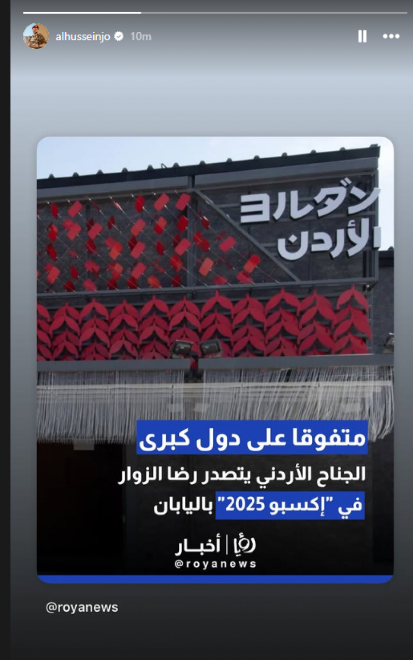 الوقائع الإخبارية: - أعاد سمو الامير الحسين بن عبدالله الثاني، ولي العهد، نشر خبر عبر موقع التواصل الاجتماعي انستقرام عن تصدر الجناح الأردني رضا الزوار بمعرض إكسبو 2025.