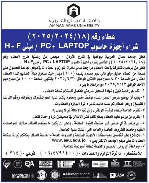 الوقائع الاخبارية:تعلن جامعة عمان العربية عن رغبتها بطرح عطاء رقم (18/2024-2025) شراء اجهزة LAPTOP + PC / مبنى H+F