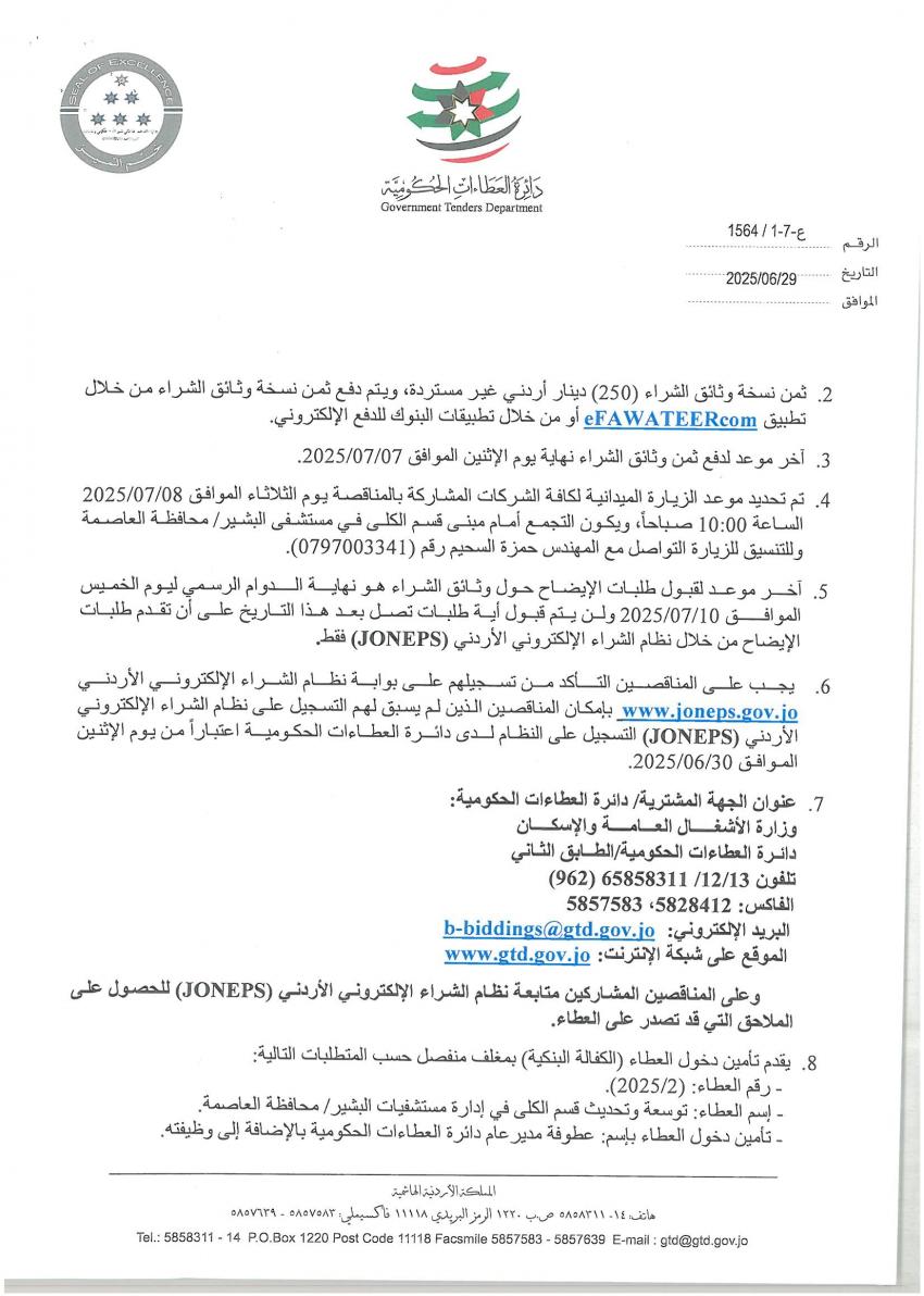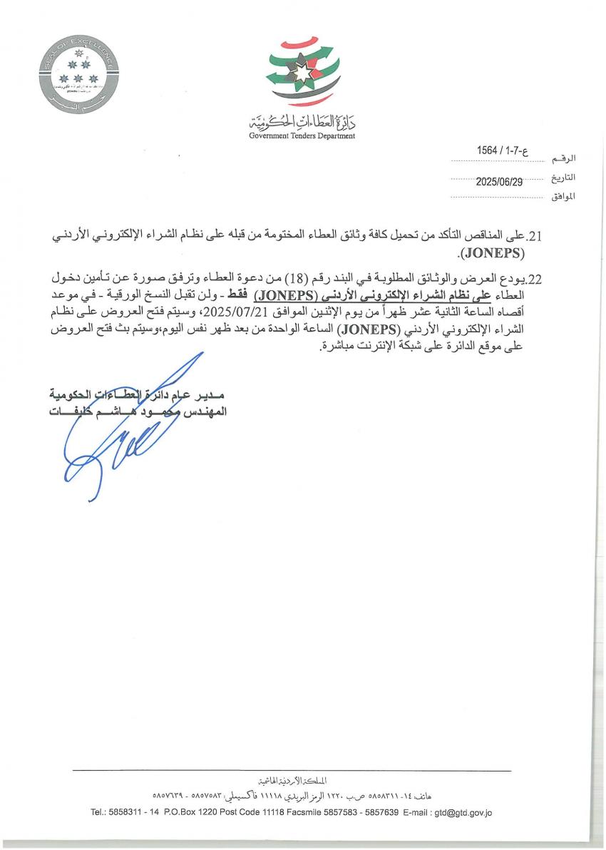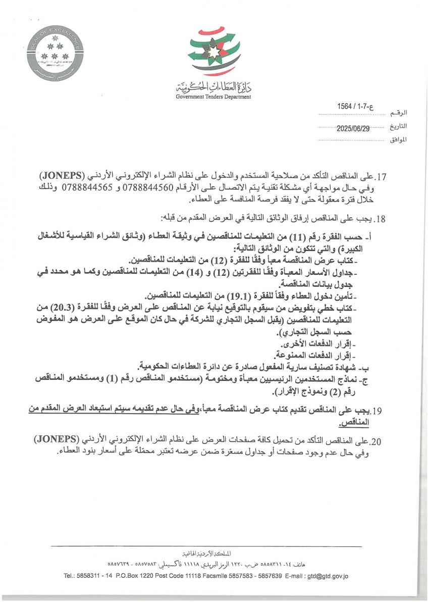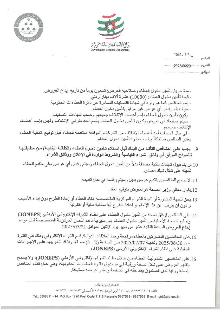 وعلى الراغبين بالاشتراك في هذه المناقصة سحب الدعوة من خلال موقع دائرة العطاءات الحكومية أو من خلال نظام الشراء الإلكتروني الأردني (JONEPS) وذلك اعتباراً من يوم الإثنين الموافق 2025/06/30.