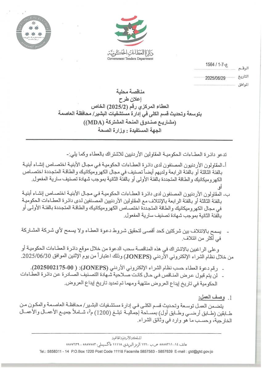 ودعت الدائرة المقاولين الأردنيين المصنفين لديها في مجال الأبنية اختصاص إنشاء أبنية بالفئة الثالثة أو بالفئة الرابعة ولديهم أيضاً تصنيف في مجال الكهروميكانيك والطاقة المتجددة اختصاص الكهروميكانيك والطاقة المتجددة بالفئة الأولى أو بالفئة الثانية بموجب شهادة تصنيف سارية المفعول، أو بالإئتلاف مع المقاولين الأردنيين المصنفين في مجال الكهروميكانيك والطاقة المتجددة اختصاص الكهروميكانيك والطاقة المتجددة بالفئة الأولى أو بالفئة الثانية للاشتراك بالعطاء.