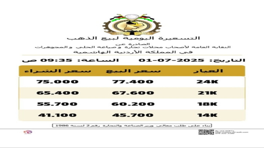 وبحسب تسعيرة النقابة، بلغت أسعار شراء غرام الذهب لأعيرة الذهب 24 و18 و14 في محلات الصاغة، 77.40 دينارا، و60.20 دينارا، و45.70 دينارا على التوالي.