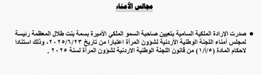 الوقائع الإخبارية: صدرت في عدد الجريدة الرسمية اليوم الثلاثاء، الإرادة الملكية السامية بتعيين صاحبة السمو الملكي الأميرة بسمة بنت طلال، رئيسة لمجلس أمناء اللجنة الوطنية الأردنية لشؤون المرأة اعتبارا من تاريخ ٢٠٢٥/٦/٢٣.