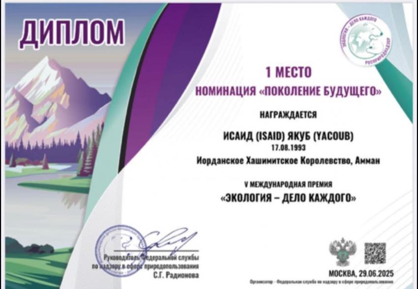 الوقائع الإخبارية: حقق الشاب الأردني يعقوب إسعيد إنجازًا عالميًا بفوزه بالمركز الأول في جائزة "جيل المستقبل” ضمن الدورة الخامسة من الجائزة الدولية لليافعين و الشباب "البيئة – قضية كل واحد”، التي تنظمها هيئة حماية الموارد الطبيعية الروسية (Rosprirodnadzor)، وذلك من بين أكثر من 340 ألف مشروع مشارك من أكثر من 150 دولة حول العالم.