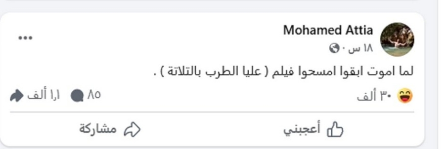 وقال عطية في منشوره: "لما أموت ابقوا امسحوا فيلم "عليا الطرب بالتلاتة""، وسرعان ما تفاعل الجمهور مع المنشور ما بين مؤيد ومعارض.